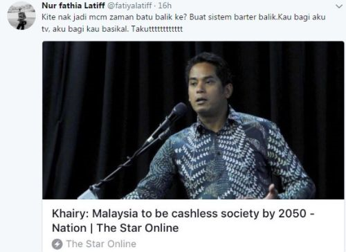 "Kita nak jadi macam zaman batu balik ke?, buat sistem barter balik. Kau bagi aku TV, aku bagi kau basikal. Takut," tulisnya dengan memuat naik paparan skrin berita berkenaan.