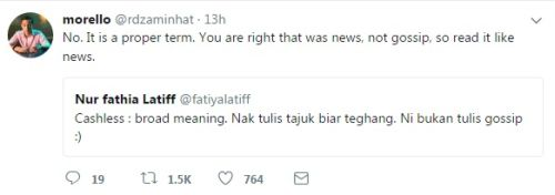 "Cashless: broad meaning. Nak tulis tajuk biar teghang (terang). Ni bukan tulis gossip," tulisnya.