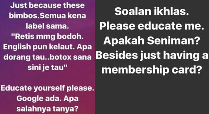 Menerusi laman Instastory, pelakon Nur Kasih itu juga mendakwa terpaksa berhadapan dengan persepsi negatif masyarakat yang berpendapat golongan artis sebagai bodoh.