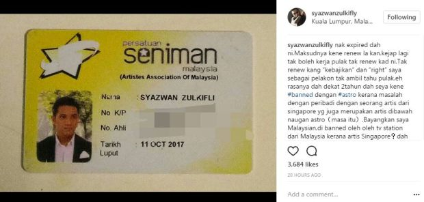 Syazwan turut memuat naik foto kad keahlian Seniman di Instagramnya berserta kapsyen dia perlu memperbaharui kad tersebut supaya kebajikan dan haknya sebagai pelakon diambil kira persatuan itu.