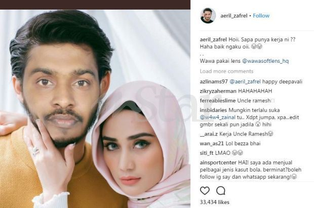 PELAKON Aeril Zafril menarik perhatian netizen apabila memuat naik dua keping gambar isterinya yang telah diedit bersama seorang pemuda berbangsa India di laman Instagramnya.