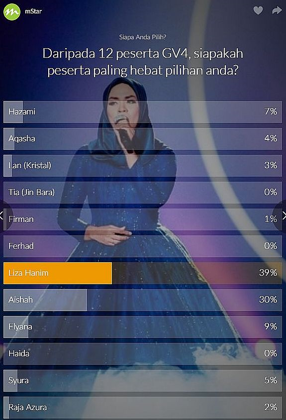 Sementara itu dalam undian awam dilakukan mStar Online setakat pukul 6 petang Isnin, pembaca portal ini memilih Liza Hanim sebagai peserta paling hebat dengan 39 peratus undian manakala Aishah menduduki tempat kedua (30 peratus) dan Elyana di tangga ke tiga (9 peratus).