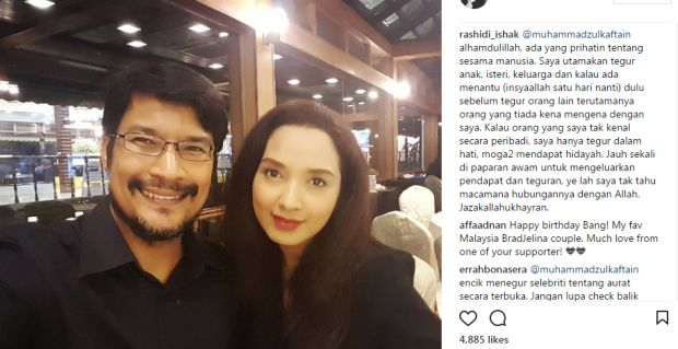 Rashidi membalas komen pengikut Instagram isterinya dengan kata-kata sopan.