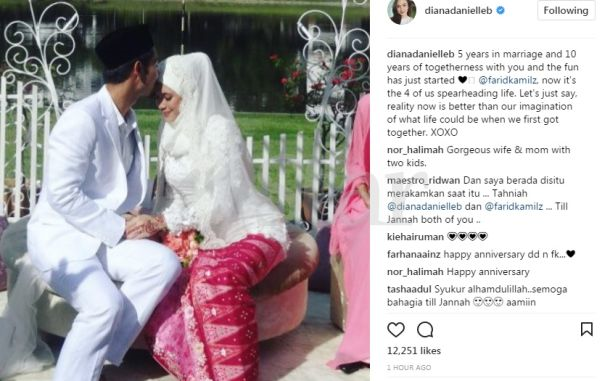 "Lima tahun dalam perkahwinan dan 10 tahun bersama anda dan keseronokan baru sahaja bermula @Faridkamilz. Sekarang kita berempat mengharungi kehidupan.