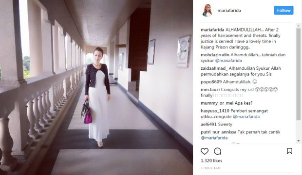 Maria berkongsi mengenai keputusan mahkamah di Instagram.
