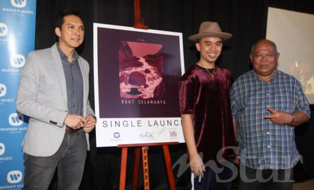 Alif bersama Pengarah urusan Warner Music (M), Darren Choy (kiri) dan Pengurus A&R Warner Music (M), Mokhtaza Ahmad pada pelancaran single terbaharunya.