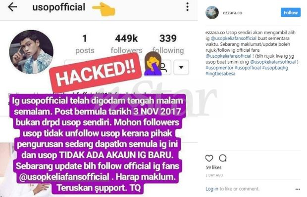 Menurut Usop, akaun hampir 500,000 pengikut miliknya itu digodam sejurus dia meminta pihak tidak bertanggungjawab itu memulangkan semula Instagram pelakon drama My Coffee Prince itu.