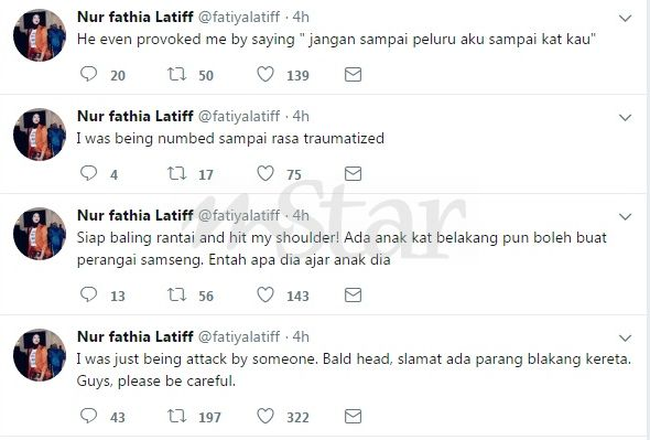 Fathia atau nama sebenarnya Nur Fathia Abdul Latiff, 30, berkata, individu itu bertindak membaling rantai dan mengugut untuk mencederakan dirinya tanpa sebarang sebab yang diketahui.