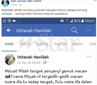 Aishah berkata, individu yang menggunakan identiti sebagai 'Ustazah Hamidah' itu perlu tampil berdepan dengannya jika berasa tidak puas hati.