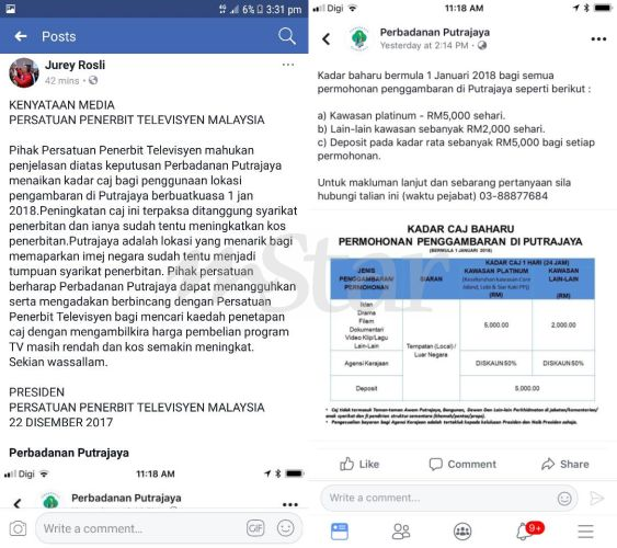 "Pihak Persatuan Penerbit Televisyen mahukan penjelasan atas keputusan Perbadanan Putrajaya menaikan kadar caj bagi penggunaan lokasi pengambaran di Putrajaya berkuatkuasa 1 Januari 2018.