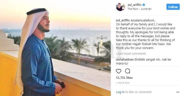 Menerusi posting terbaharu yang dimuat naik itu, Zul, 31, menulis ucapan terima kasih kepada peminat yang mendoakan kesejahteraan dia dan arwah ibunya, Robiah Nasir.