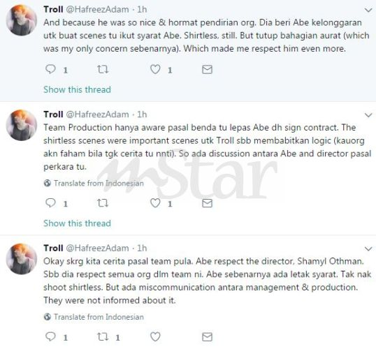 "Saya sebenarnya ada letak syarat. Tak nak lakon babak tanpa pakai baju. Tapi ada salah faham antara pengurusan dan produksi. Mereka tidak dimaklumkan perkara itu.