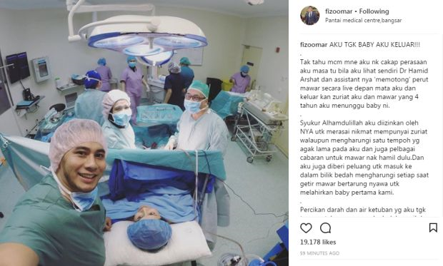 Fizo, 32, menerusi Instagramnya memberitahu perasaannya bercampur baur apabila diberi peluang melihat sendiri proses kelahiran selepas mengharungi pelbagai cabaran sebelum isterinya, Mawar Abdul Karim disahkan hamil.