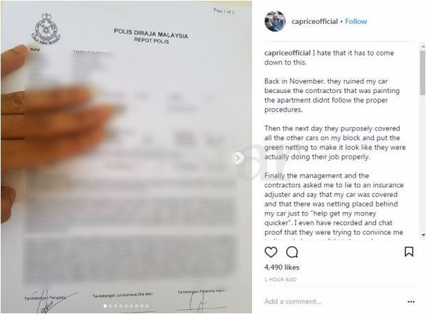 Caprice juga telah membuat laporan polis terhadap dua pihak tersebut yang tidak mahu bertanggungjawab atas kecuaian mereka.