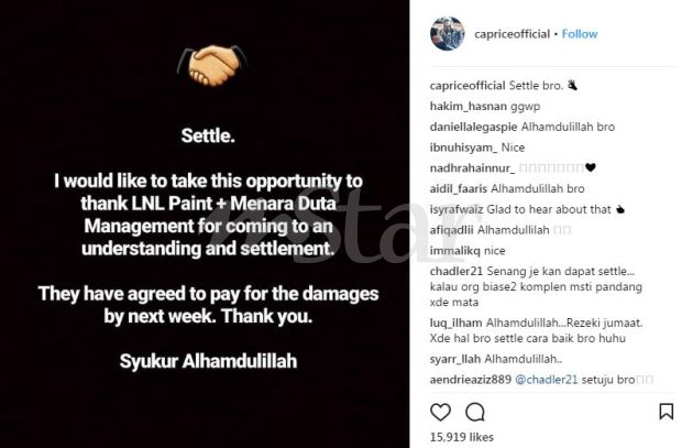 ISU pihak pengurusan kondominium dan kontraktor yang tidak mahu membayar ganti rugi kereta dan meminta penyanyi Caprice untuk berbohong pada pihak insuran berakhir dengan baik. Caprice menerusi laman Instagramnya meluahkan rasa syukur dan ucapan terima kasih pada pihak pengurusan Menara Duta dan LNL Paint yang memahami serta menyelesaikan perkara tersebut. Menurutnya, pihak tersebut akan membayar semula ganti rugi kerosakan yang dialaminya pada minggu depan. "Saya nak ambil peluang ini untuk mengucapkan terima kasih pada LNL Paint dan pengurusan Menara Duta yang memahami dan selesaikan. "Mereka dan bersetuju untuk bayar kos kerugian pada minggu depan. Terima kasih. Syukur Alhamdulillah," tulis Caprice. Caprice bersyukur pihak tersebut bersetuju membayar semula ganti rugi. Rata-rata pengikutnya di laman sosial turut gembira dengan isu tersebut dapat diselesaikan dengan cara baik. Tak Bayar Ganti Rugi, Diminta Pula Menipu - Caprice Sebelum ini Caprice memuat naik foto kereta mewah jenis Dodge Challenger miliknya dipenuhi tompok cat kekal yang digunakan untuk mengecat dinding bangunan ketika kerja-kerja penyelenggaran pada November tahun lalu. Kos kerugian yang terpaksa ditanggung oleh penyanyi rap itu adalah sekitar RM5,000. Kata Caprice, kedua-dua pihak terbabit enggan bertanggungjawab di atas kecuaian mereka dan dia terpaksa melaporkan perkara itu kepada pihak polis. Caprice juga mempunyai bukti pihak tersebut cuba menyakinkan dia untuk berbohong pada pihak insuran bagi mendapatkan wang dengan cepat.