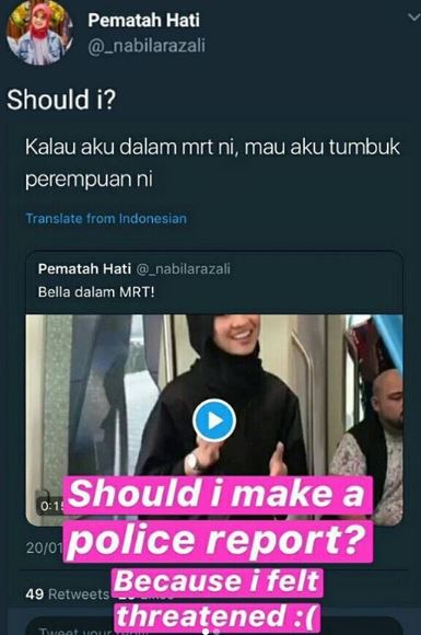Terdahulu, pemilik akaun Twitter @pikajue menulis "Kalau aku dalam MRT ni, mau aku tumbuk perempuan ni".