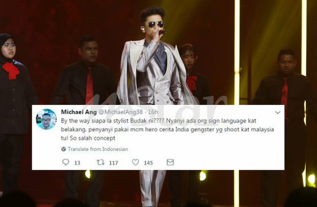 "By the way siapa la stylish budak ni? Nyanyi ada orang sign language kat belakang, penyanyi pakai macam hero cerita India gengster yang shoot kat Malaysia tu. Salah konsep!" tulisnya.
