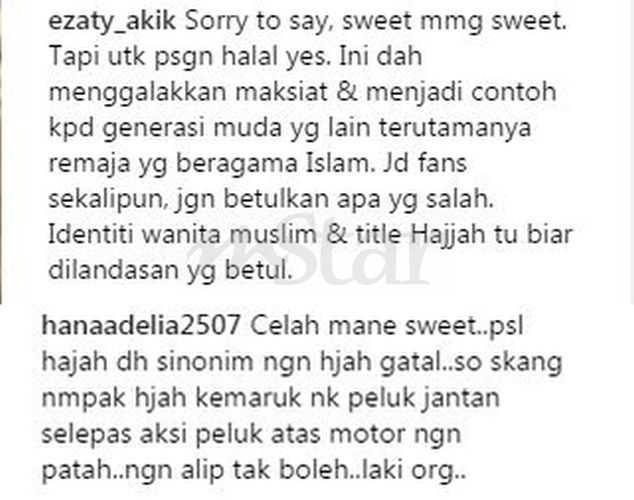 "Maaf untuk cakap, sweet memang sweet tapi untuk pasangan halal ya. Ini dah menggalakkan maksiat dan menjadi contoh kepada generasai muda terutamanya remaja beragama Islam."Jadi, peminat sekalipun, jangan betulkan apa yang salah. Identiti wanita muslim dan gelaran Hajah itu biar di landasan yang betul," tulis salah seorang netizen.