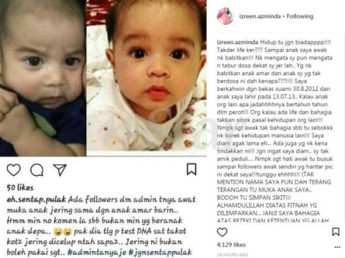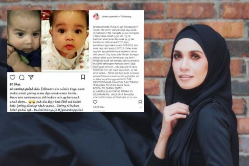 Izreen mengulas berkaitan sebuah akaun Instagram yang mencantumkan foto anaknya bersama wajah anak pelakon Amar Baharin dan Amyra Rosli dengan mendakwa kanak-kanak itu berwajah seiras yang berkemungkinan daripada darah yang sama.