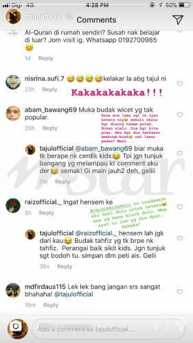 Menurut Tajul, 20, dia sudah lama tidak melayan 'haters' di Instagram dan berasakan perlu sesekali membalas komen mereka dengan tujuan memberi pengajaran.