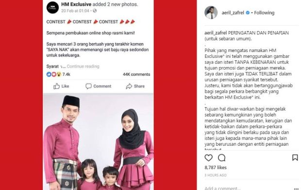 Aeril Zafrel muat naik status penafian di Instagramnya.