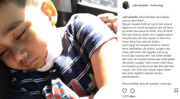 "Kami suami-isteri terus ke hospital yang seterusnya dan bila tengok luka Rayyan, doktor beritahu lukanya perlu dijahit tiga lapisan secara pembedahan," tulisnya dalam Instagram.