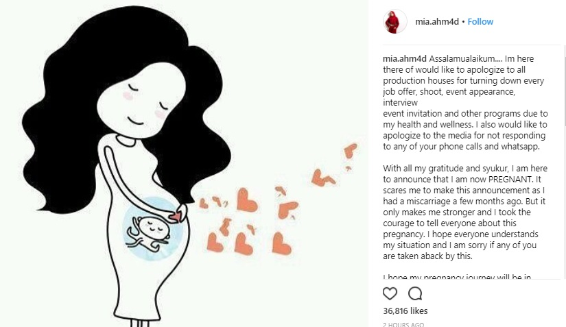Menerusi perkongsian di laman Instagram, Mia berkata awalnya dia agak bimbang untuk memaklumkan tentang kehamilan itu kerana pernah mengalami keguguran beberapa bulan lalu.