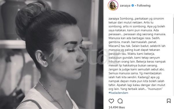 PETALING JAYA: Pelakon Zara Zya menyifatkan kerjaya seorang artis atau selebriti mendedahkan diri mereka untuk terpalit dengan tuduhan sombong. Zara Zya atau nama sebenarnya Zainurul Razia Mohd Zainuddin, 32, berkata mereka juga manusia biasa yang mempunyai perasaan dan masalah peribadi sama seperti orang lain. "Sombong... perkataan yang sinonim keluar dari mulut netizen. Artis tu sombong, artis ni sombong. "Apa yang boleh saya katakan, kami pun manusia. Ada perasaan... perasaan sebagai seorang manusia. Manusia kan ada berbagai rasa. Sedih, gembira, marah, bermasalah, penat. Macam-macam tau tak?" ujarnya. Tambah pelakon drama Mona Lisa ini, kerjaya sebagai selebriti menyebabkan seseorang itu tidak dapat lari daripada tekanan perasaan. Status yang dimuat naik Zara Zya tentang kehidupan sebagai seorang artis. Katanya, dia perlu sentiasa senyum dan menghiburkan orang lain biarpun berhadapan dengan masalah peribadi. "Selain badut, selebritilah manusia yang paling kuat dapat tekanan perasaan tau. Waktu kami bekerja, walaupun gundah, kami tetap senyum hiburkan orang lain. "Bekerja keras nampak mewah tapi hakikatnya bukan senang," ujarnya. Selain itu, Zara meminta agar masyarakat dan netizen tidak mudah menghukum seseorang artis terutama yang tidak dikenali secara dekat. "Janganla hukum kami semudah sebut abc. Semua manusia sama yang membezakan ialah hati kita sendiri. "Kadang-kadang apa yang nampak depan mata pun kita boleh salah tafsir. Apatah lagi kalau dengar dari mulut orang lain," katanya. Dalam perkembangan lain, Zara baharu sahaja keluar dengan single pertama berjudul Tiada Dendam. Lagu berkenaan merupakan ciptaan Liuney nur dan Fauzi Aisunam dan kini boleh didengar di semua platform digital. "Lagu ini saya hadiahkan supaya semua orang jadi positif. Walau apa pun jadi, tetap kena kuat. Mesti ada hikmah. Ia juga hadiah buat peminat-peminat saya," ujarnya.