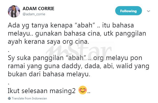 "Ada yang tanya kenapa 'Abah'... itu bahasa Melayu. Gunakan bahasa Cina untuk panggilan ayah kerana saya orang Cina.