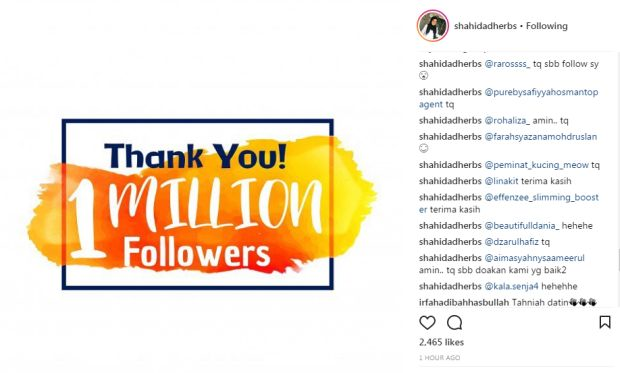 "Wow! Satu juta penyokong di Instagram isteri saya. @shahidadherbs tahniah... walaupun awak hanya buat untuk 'stalk' saya , jenuh paksa untuk kemas kini dengan memuat naik gambar dan video.