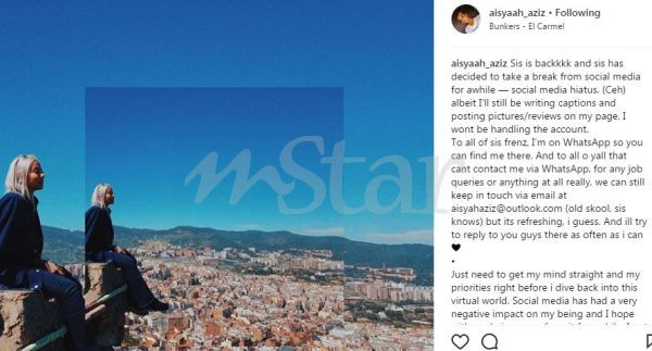 "Saya memutuskan untuk berehat sebentar dari media sosial buat sementara waktu. Tapi saya masih menulis kapsyen pada laman sosial saya cuma saya tidak mengendalikan akaun peribadi itu.