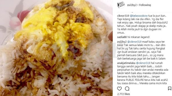 Zul sebelum itu memuat naik foto makanan dengan kapsyen memberi gambaran dia kini hidup bersendiri.