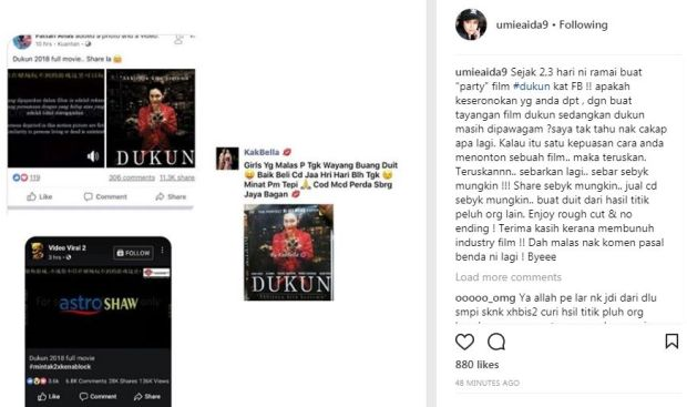 Sebelum ini, Umie dalam posting berbeza di Instagram menyeru agar penonton dan peminat filem di negara ini memboikot cetak rompak.