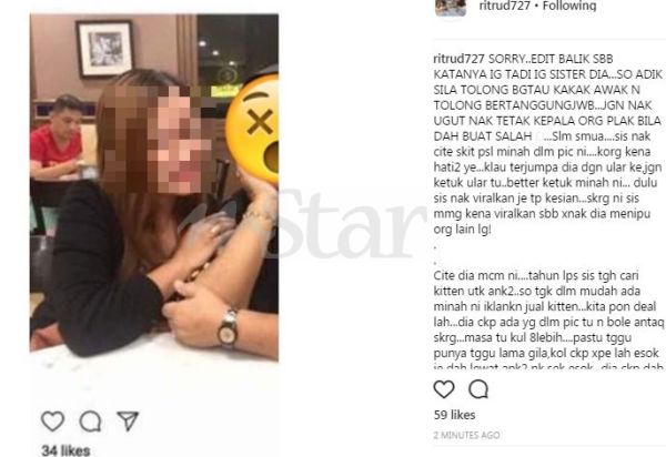 "Minah ini gunakan nama saya dan dia cakap dia dulu jual kucing pada saya tapi mati sebab anak-anak saya duduk atas kucing itu. Malah kucing yang dijual kepada hamba Allah ini juga tidak sihat macam yang saya dapat," ujarnya.
