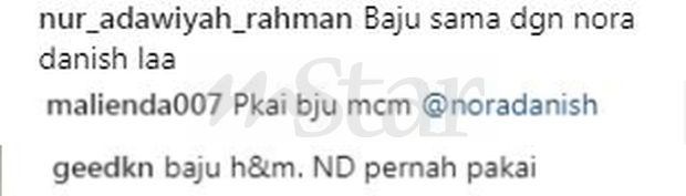 Antara netizen yang mempertikaikan baju Fasha dan Nora sama.