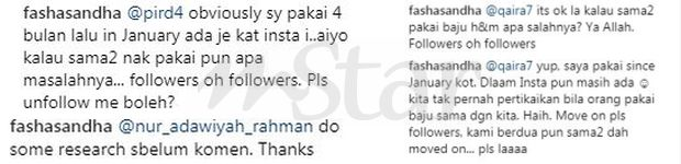 "Apa masalah korang ini baju sama pun nak kecoh. Tak kisah siapa pakai pun. Baju ni kilang buat, jadi sudah tentu boleh jumpa sesiapa pakai. Sama pun apa masalahnya?" komen pengikutnya.
