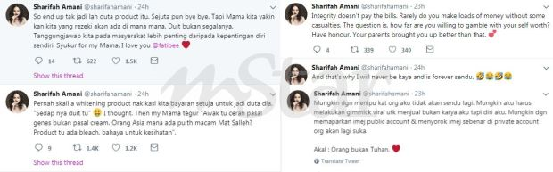 "Akhirnya tak jadi duta produk itu. Sejuta pun bye bye. Tapi mama kita yakinkan kita yang rezeki akan ada di mana-mana," kata Amani menerusi laman Twitternya.
