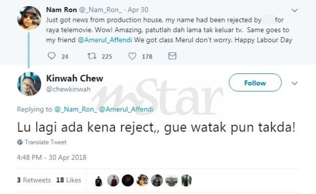 "Lu (awak) lagi ada kena reject, gua (saya) watak pun tak ada," tulisnya.