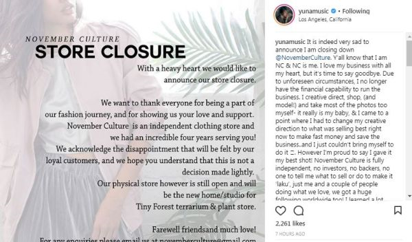 PENYANYI Yuna terpaksa menutup butik pakaiannya iaitu November Culture yang beroperasi hampir empat tahun di Subang Jaya, Selangor.