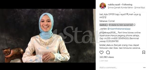PENYANYI Nabila Razali menerima teguran netizen mengenai tudungnya yang dipakai singkat menerusi video ucapan selamat berpuasa.