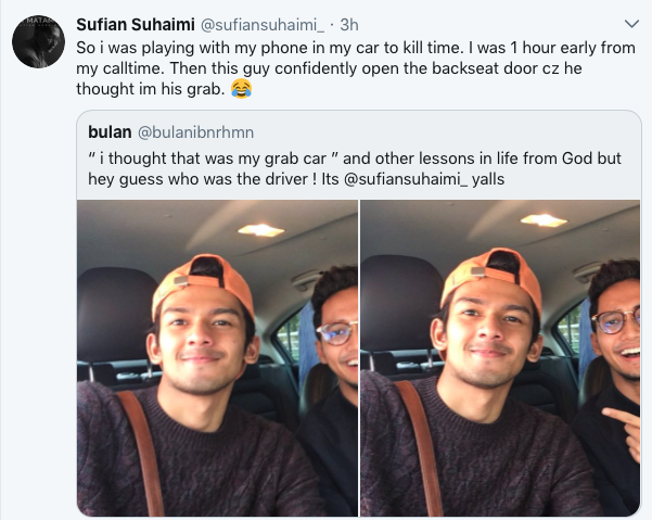 “Saya fikir ini adalah Grab Car yang saya tempah dan ia adalah pengajaran buat saya daripada Allah tapi hey... teka siapa pemandunya. Ia Sufian Suhaimi!” tulisnya di Twitter pada Selasa.