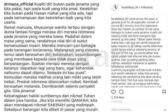Farah menerusi Instagram turut berkongsi dan bersetuju dengan pendapat Mufti Perlis, Datuk Dr Asri Zainul Abidin berkaitan barang jenama yang menjadi kegilaan kaum wanita masa kini.