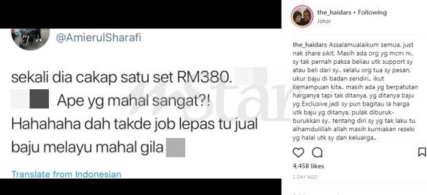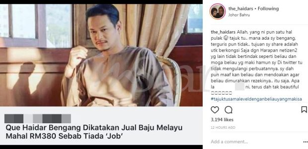Sebelum ini, pelakon filem Ophilia itu ada memuat naik komen netizen yang mempersoalkan harga Baju Melayu yang dijual mahal disebabkan tiada tawaran berlakon.