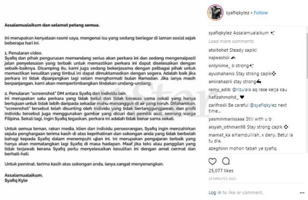 Syafiq memuat naik kenyataan ringkas di laman Instagramnya.