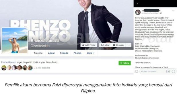 Katanya, paparan skrin itu disunting oleh individu tidak bertanggungjawab dan menggunakan foto lelaki berasal dari Filipina.