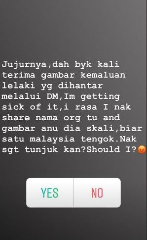 "Jujurnya dah banyak kali terima gambar kemaluan lelaki yang dihantar melalui DM, I'm getting sick of it!," tulisnya di InstaStory.