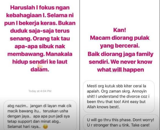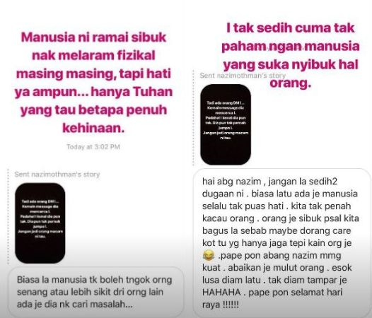 Nazim turut berkongsi mesej positif diterima daripada peminatnya di ruang InstaStory dan memberitahu dia fokus terhadap kebahagian dirinya dan orang lain tidak berhak menilai apa yang berlaku.