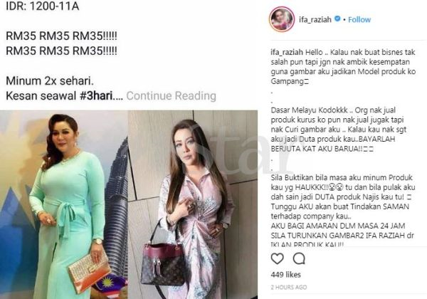 PENYANYI Ifa Raziah memberi amaran untuk mengambil tindakan undang-undang terhadap sebuah produk kurus yang menggunakan foto-fotonya dengan tujuan promosi.