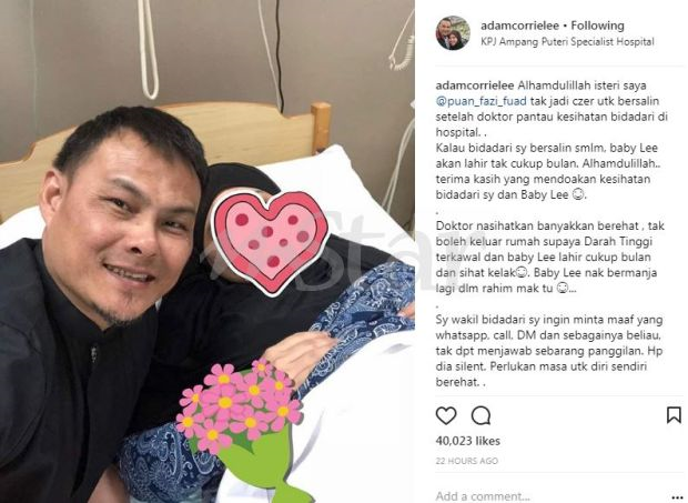 Adam memberitahu keadaan isterinya menerusi laman Instagram miliknya.