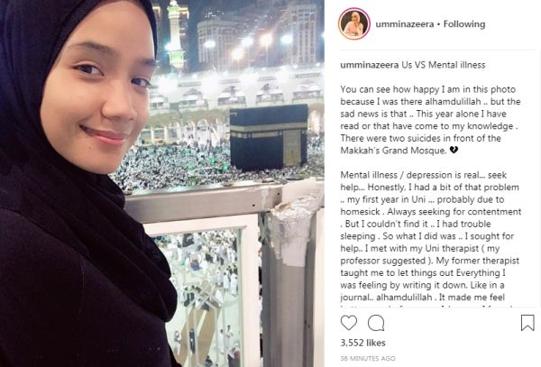 "Penyakit mental atau kemurungan adalah benar, cari bantuan. Jujur, saya mempunyai sedikit masalah itu ketika tahun pertama saya di Universiti. Mungkin disebabkan rindu.